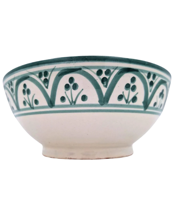 This M3lme ceramic bowl is handcrafted by artisans and features traditional Moroccan motifs, including geometric patterns and floral elements. Made from durable ceramic with a lead-free glaze, Crafted by m3lme in the Middle Atlas Mountains of Morocco from locally sourced clay. it is suitable for serving food or for use as a decorative piece. Due to the handcrafted nature of this item, slight variations in pattern and color may occur, adding to its unique character.