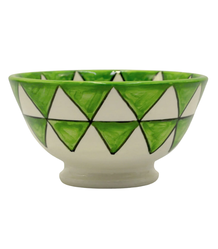 This M3lme ceramic bowl features a hand-painted lime green triangle pattern, double-painted inside and out with a durable, abrasion-resistant glaze. Crafted by m3lme in the Middle Atlas Mountains of Morocco from locally sourced clay, it is inspired by traditional Moroccan and Islamic geometric art. Suitable for kitchen use, serving, or as a decorative piece. Due to the handcrafted nature of this item, slight variations in size and pattern may occur.