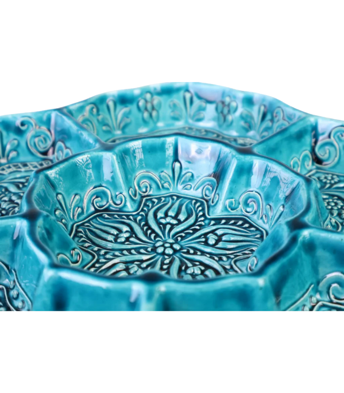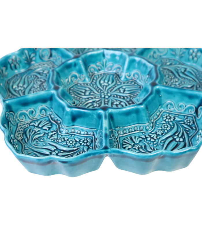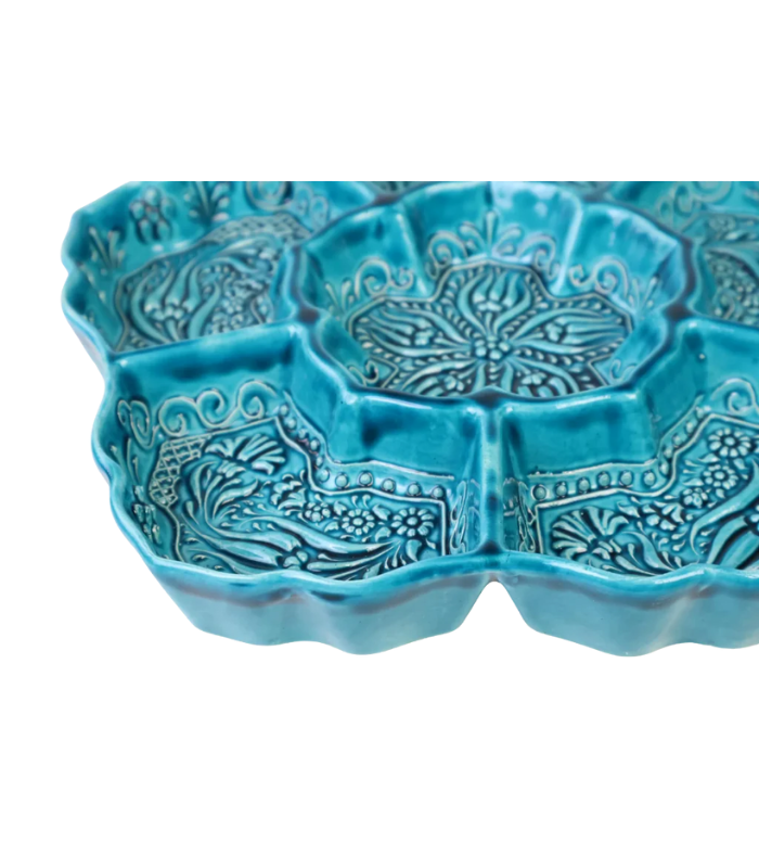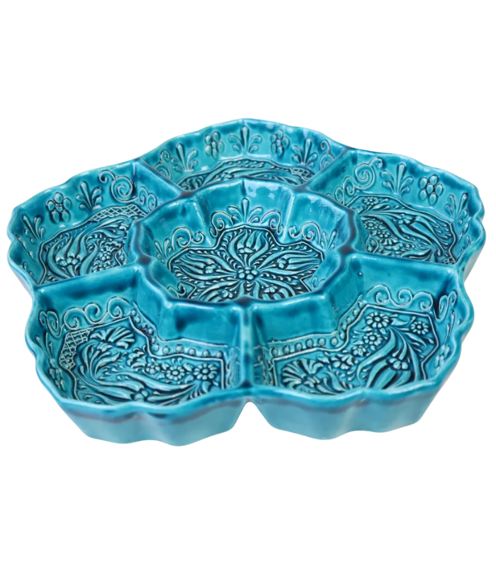 This M3lme ceramic snack tray features a flower-shaped design with divided compartments, hand-painted by artisans in turquoise and teal. Crafted by m3lme in the Middle Atlas Mountains of Morocco from locally sourced clay. The design incorporates textured relief techniques for added detail. It is suitable for serving a variety of snacks and dips or for organizing small items. Due to the handcrafted nature of this item, slight variations in pattern and color may occur.